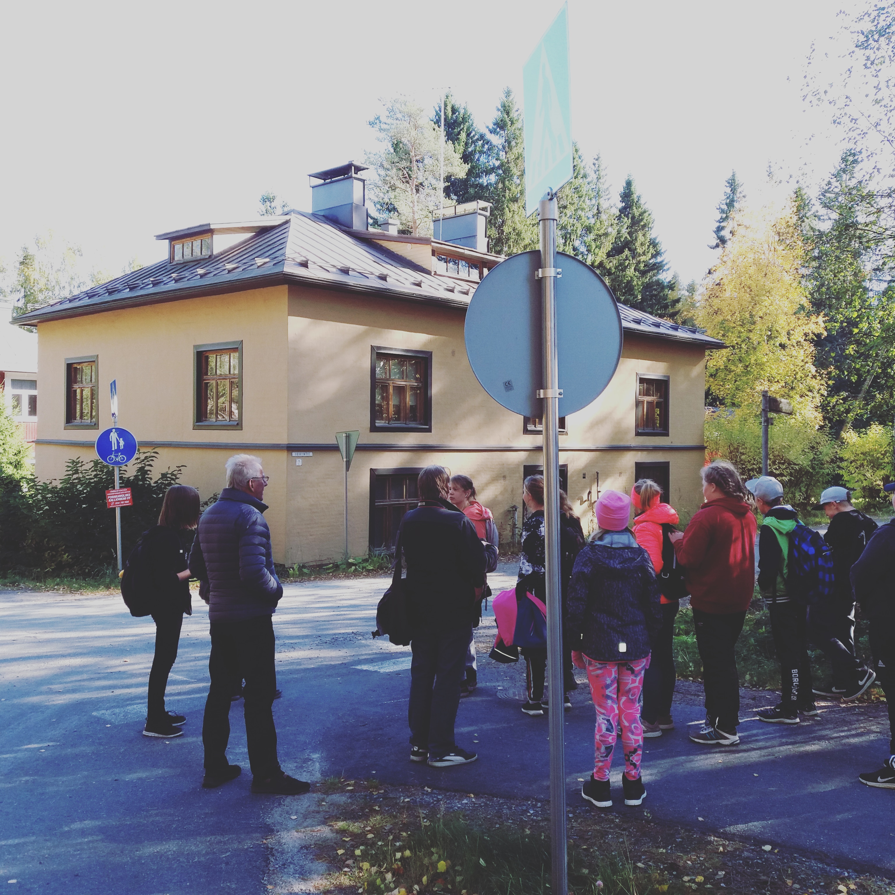 Kuva: Haapamäen 4-lk ja 5-lk. tutustumassa taajaman vanhoihin rakennuksiin yhdessä Haapamäen perinneyhdistyksen Pekka Kosken ja valokuvaaja Esko Soinin kanssa syyskuussa 2018. Kuva Keuruun museo.